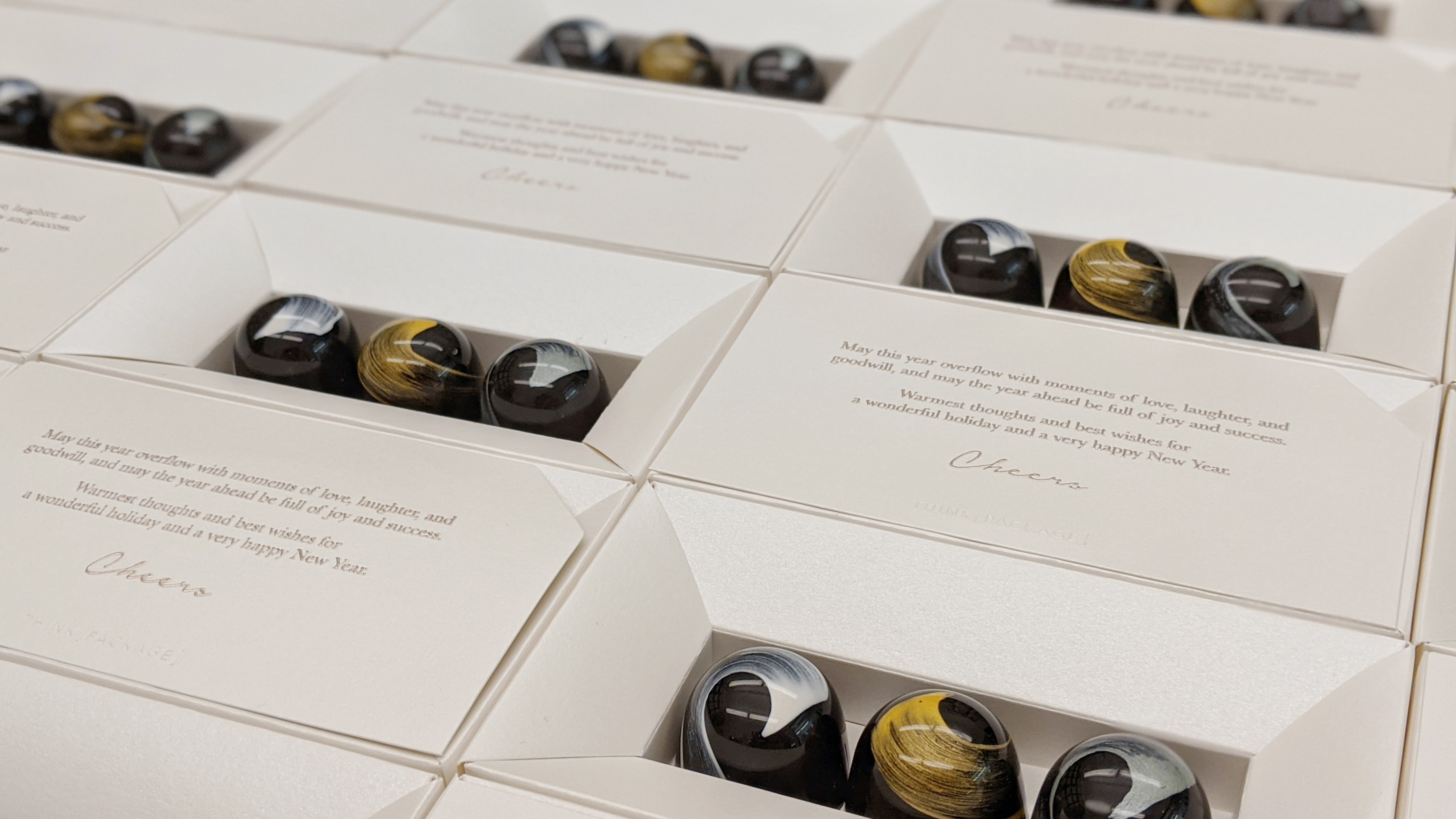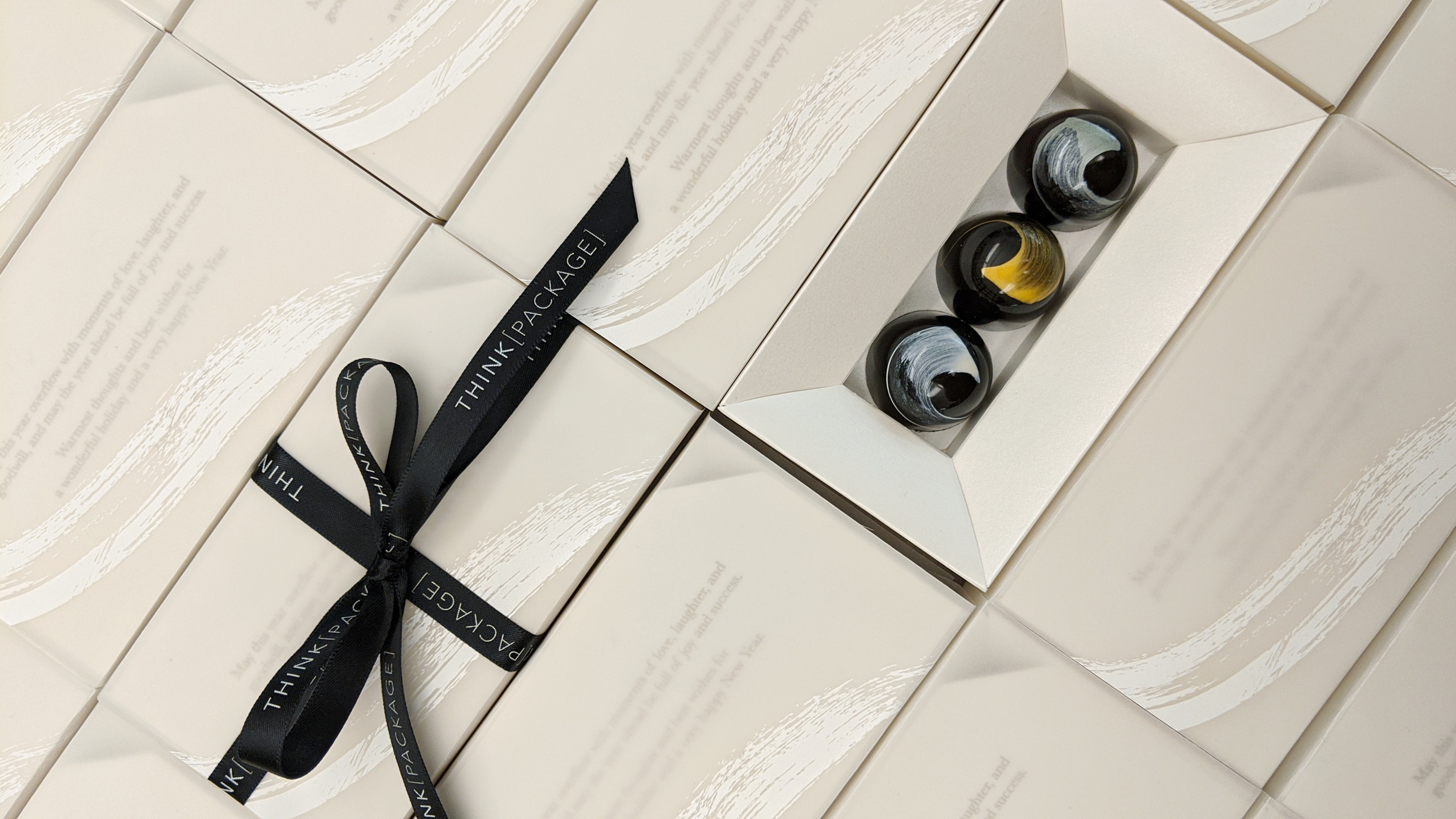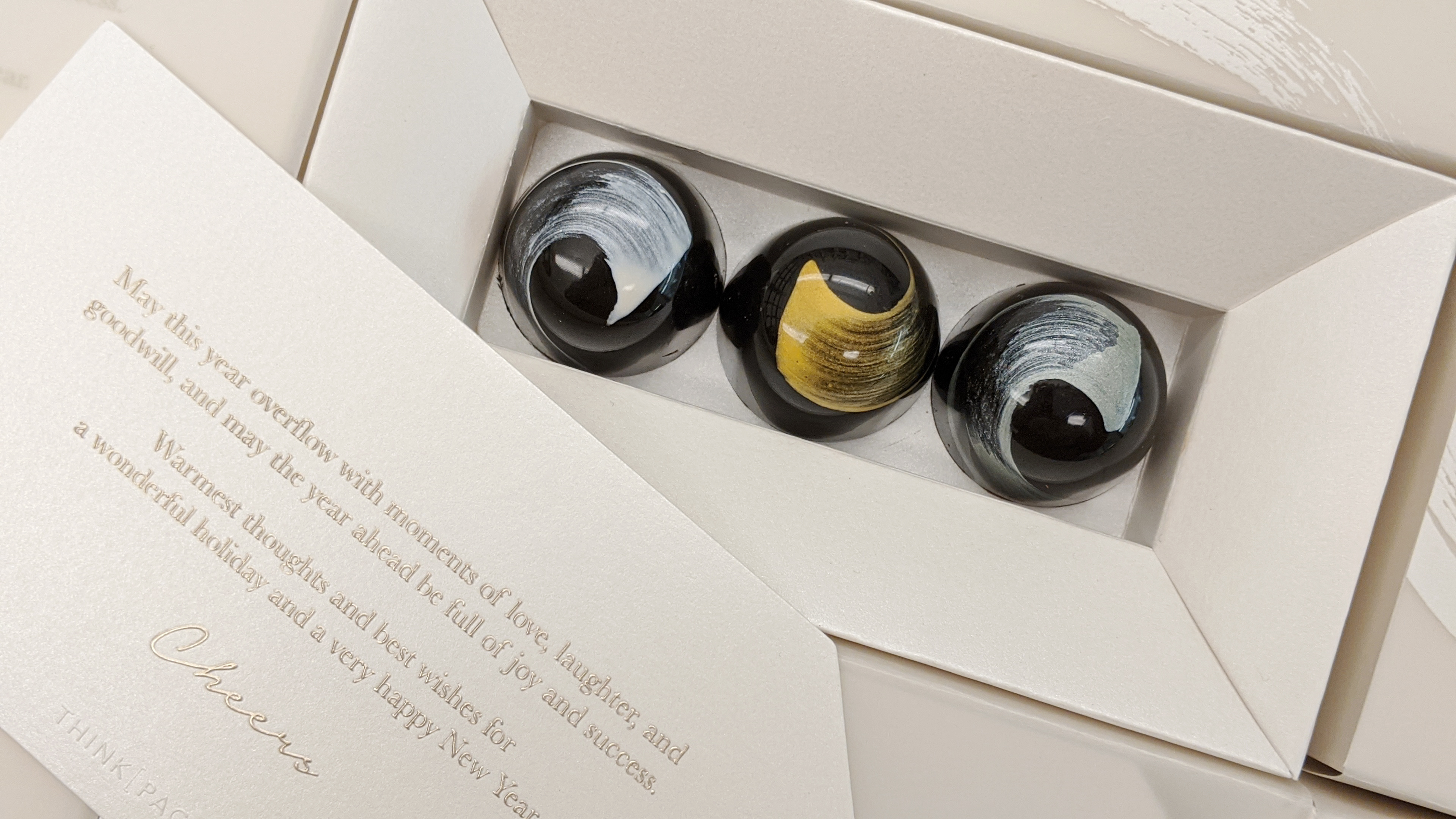 The Thinkpackage Holiday Box is one of the annual gifts to thank our beloved clients. For 2019, we have chosen to feature Stick With Me's beautiful handmade chocolate bonbons, with its chocolate artwork uniquely created for this gift box.